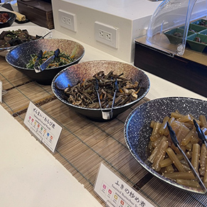 山形の山菜・お漬物、焼きたてのパン、その場で作る目玉焼き、寝起きに優しいお粥。